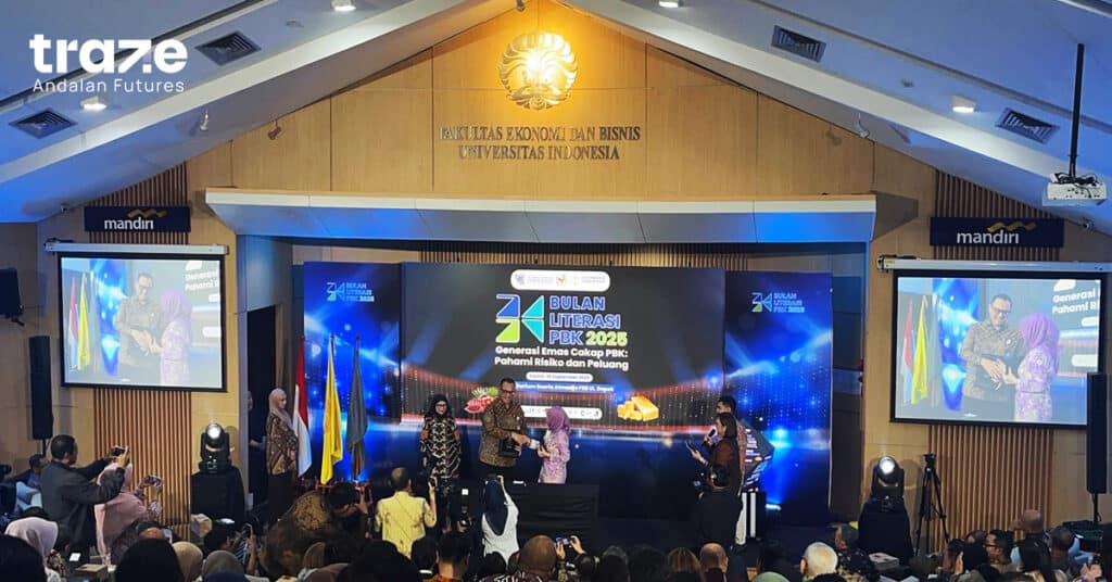 PT. Traze Andalan Futures berpartisipasi aktif dalam Bulan Literasi Perdagangan Berjangka Komoditi (PBK) 2025 dengan mengusung tema “Generasi Emas Cakap PBK: Pahami Risiko dan Peluang”. Kegiatan ini digelar di Auditorium Soeria Atmadja, Fakultas Ekonomi dan Bisnis Universitas Indonesia (FEB UI), Depok, Jawa Barat, sebagai wujud nyata komitmen perusahaan dalam mendorong literasi keuangan dan memperluas pemahaman publik tentang perdagangan berjangka.