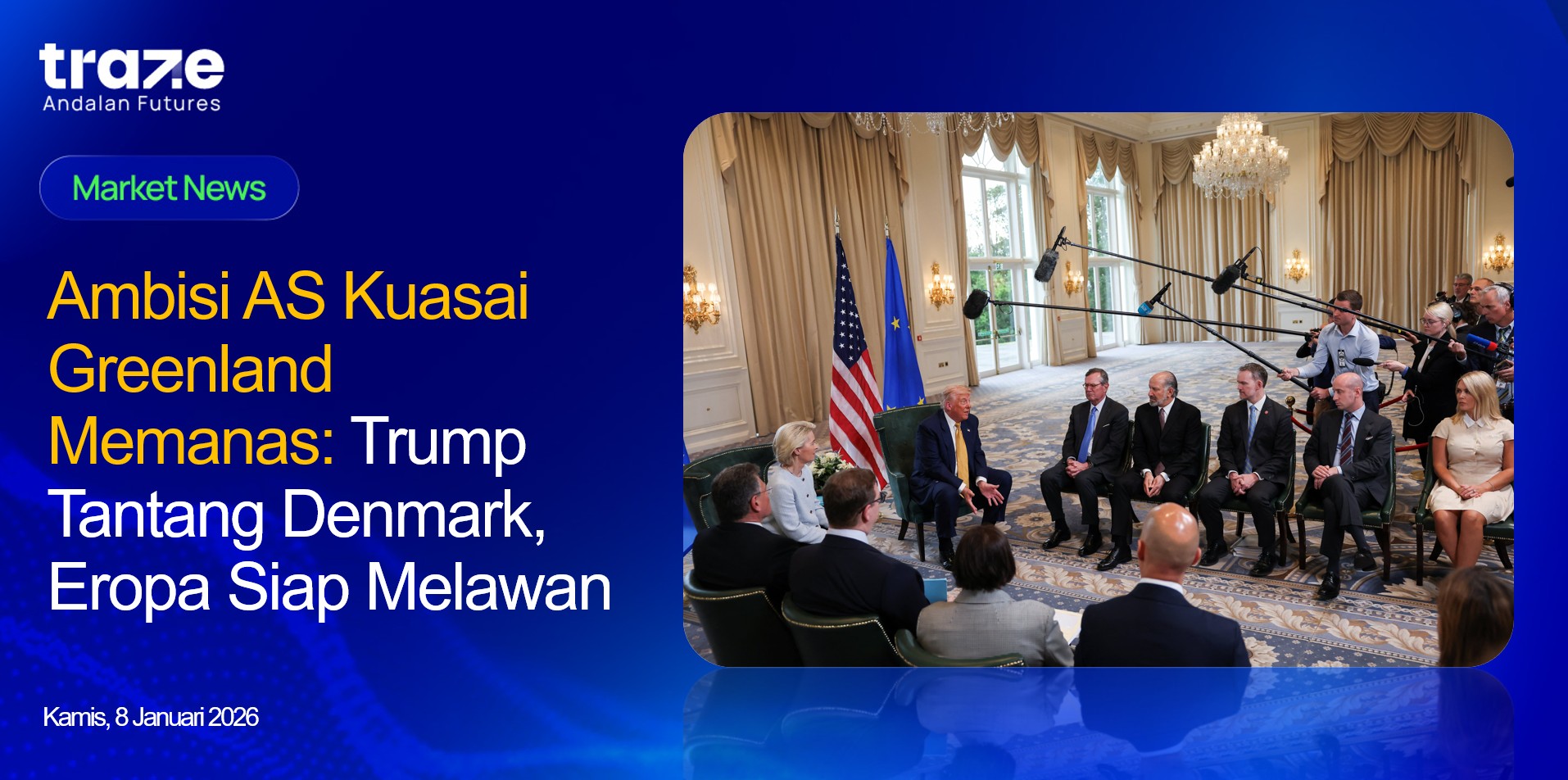 Pemerintahan Donald Trump kembali memicu ketegangan geopolitik setelah mengonfirmasi rencana pertemuan dengan Denmark untuk membahas potensi akuisisi Greenland. Isu ini mencuat di tengah meningkatnya kekhawatiran Eropa terhadap ambisi teritorial Amerika Serikat, terutama setelah langkah militer AS di Amerika Latin. Trump menegaskan minatnya pada pulau kaya mineral tersebut dengan alasan strategis dan keamanan nasional, meski mendapat penolakan tegas dari Denmark dan pemerintah Greenland.