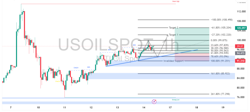 Apabila harga mampu bertahan di atas area support 95 – 96, peluang kenaikan masih terbuka dengan target teknikal pertama di sekitar 102. Jika momentum beli terus menguat dan resistance tersebut berhasil ditembus, pergerakan berpotensi berlanjut menuju area 105 sebagai target berikutnya. Namun, skenario bullish dapat melemah apabila harga turun dan menembus area 91, yang berpotensi memicu tekanan jual lebih dalam pada pasar minyak.