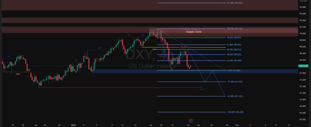 Pergerakan Indeks Dolar AS (DXY) pada timeframe empat jam menunjukkan perubahan struktur pasar setelah harga gagal bertahan di area supply zone. Munculnya sinyal change of character menandakan dominasi seller mulai menguat, diperkuat oleh penolakan dari area Fibonacci atas yang berfungsi sebagai resistance. Tekanan jual ini mendorong harga turun kembali ke area support terdekat yang kini menjadi penentu arah lanjutan.