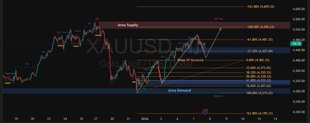 Di sisi atas, area supply menjadi zona krusial yang berpotensi memicu reaksi harga, terutama jika muncul tekanan jual jangka pendek. Namun, apabila emas mampu bertahan dan kembali menembus resistance terdekat, potensi pengujian level yang lebih tinggi semakin besar. Sebaliknya, pelemahan ke area demand berpotensi dimanfaatkan sebagai zona akumulasi selama tidak terjadi penutupan harga di bawah support kunci.