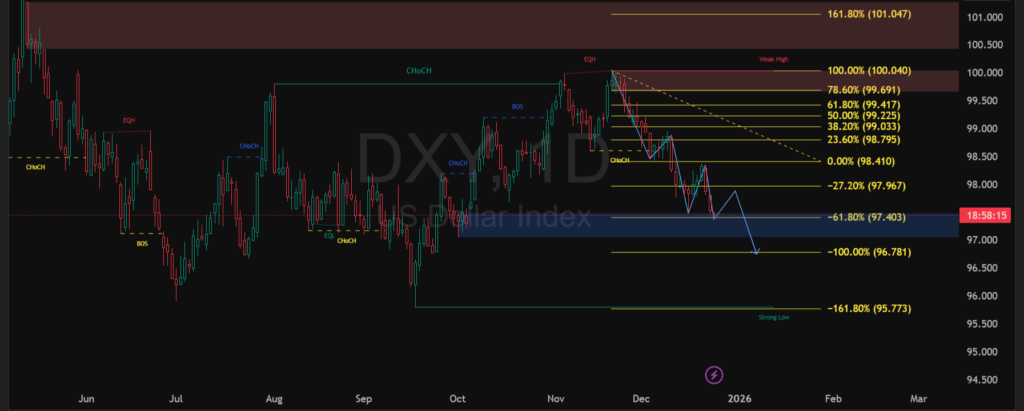 Indeks Dolar AS (DXY) masih berada dalam tekanan setelah gagal menembus area resistance utama di sekitar level 100. Struktur grafik mengindikasikan dominasi seller dengan terbentuknya pola penurunan yang memperkuat arah bearish.