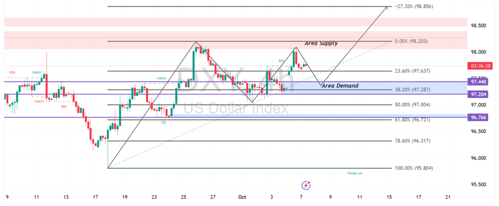 Struktur harga masih mencerminkan pola higher low, menandakan momentum bullish belum sepenuhnya hilang. Jika pantulan terjadi dari area demand, peluang kenaikan menuju 98.200 bahkan 98.850 tetap terbuka, sejalan dengan proyeksi Fibonacci extension.