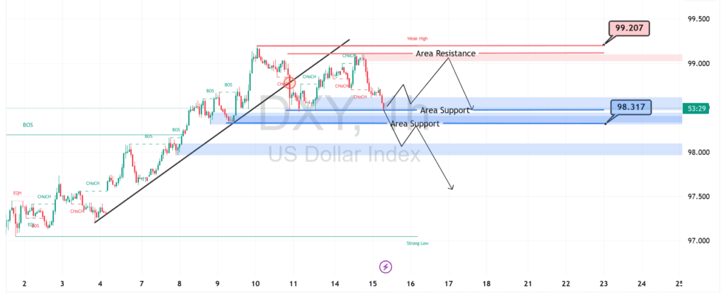 Jika DXY berhasil memantul dari $98.317, target berikutnya adalah menguji ulang Area Resistance $99.207. Namun, penembusan support ini ke bawah akan memicu skenario bearish, mendorong harga menuju level $98.000 dan mengonfirmasi pembalikan momentum pasar.