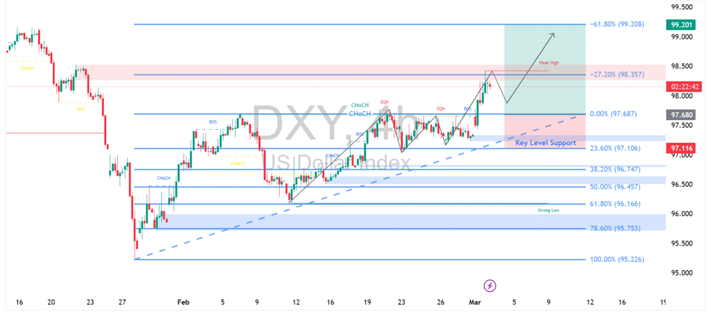 Indeks dolar AS (DXY) pada timeframe empat jam menunjukkan penguatan setelah berhasil menembus area konsolidasi di sekitar 97,70. Breakout ini mengonfirmasi dominasi buyer sekaligus melanjutkan struktur kenaikan yang ditopang garis tren naik. Selama harga bertahan di atas support penting 97,10, momentum bullish masih berpeluang berlanjut dengan area tersebut berfungsi sebagai zona penopang utama jika terjadi pullback.
