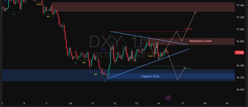 Apabila harga breakdown dari garis tren naik, potensi penurunan menuju support kembali terbuka dengan target awal sekitar 96.30. Sebaliknya, skenario bullish baru terbentuk bila terjadi breakout bersih di atas 97.00 karena dapat memicu percepatan kenaikan menuju area supply berikutnya.