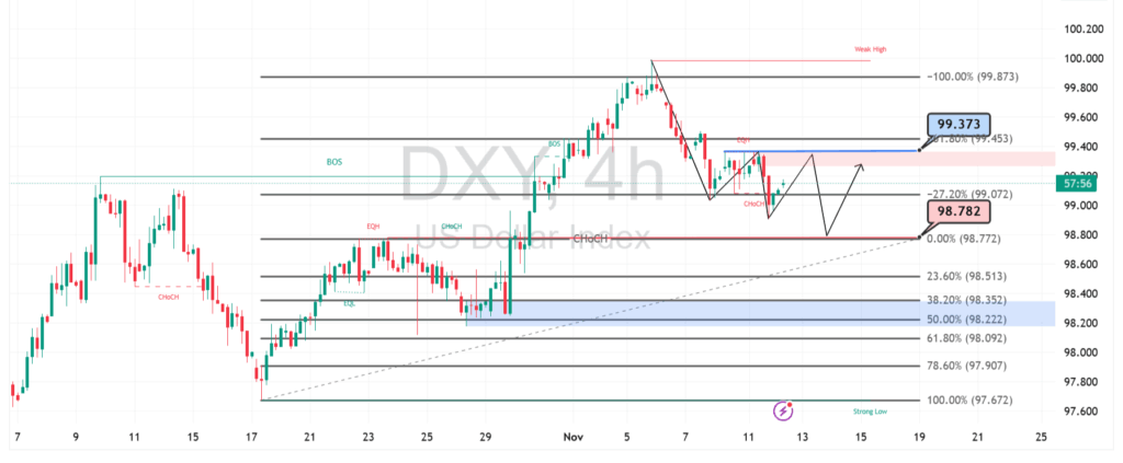 Jika harga menembus 98.78, DXY berpeluang turun lebih dalam menuju area 98.20 sebagai zona support berikutnya. Namun, bila mampu menembus 99.37, peluang rebound menuju 99.87 masih terbuka.