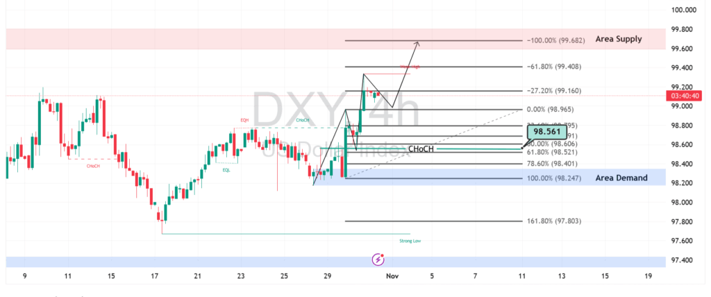 Koreksi ringan ke area 98.5–98.6 bisa menjadi titik pantulan sebelum melanjutkan kenaikan. Selama harga bertahan di atas zona demand 98.25, arah pasar masih positif.