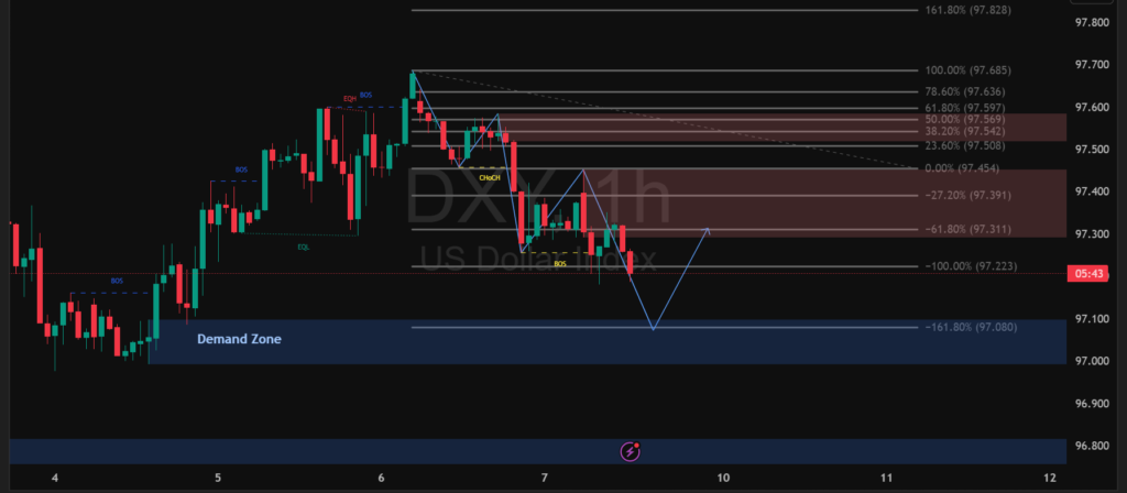 Indeks dolar (DXY) pada timeframe satu jam terlihat berada dalam fase pelemahan setelah gagal bertahan di area resistance Fibonacci 50–61,8 persen di sekitar 97,55–97,60. Struktur harga menunjukkan perubahan karakter (CHoCH) disusul penembusan struktur bawah (BOS) yang menandakan tekanan jual masih dominan. Saat ini pergerakan mendekati level ekstensi 100 persen di kisaran 97,23, yang menjadi support terdekat sebelum harga berpotensi melanjutkan penurunan.