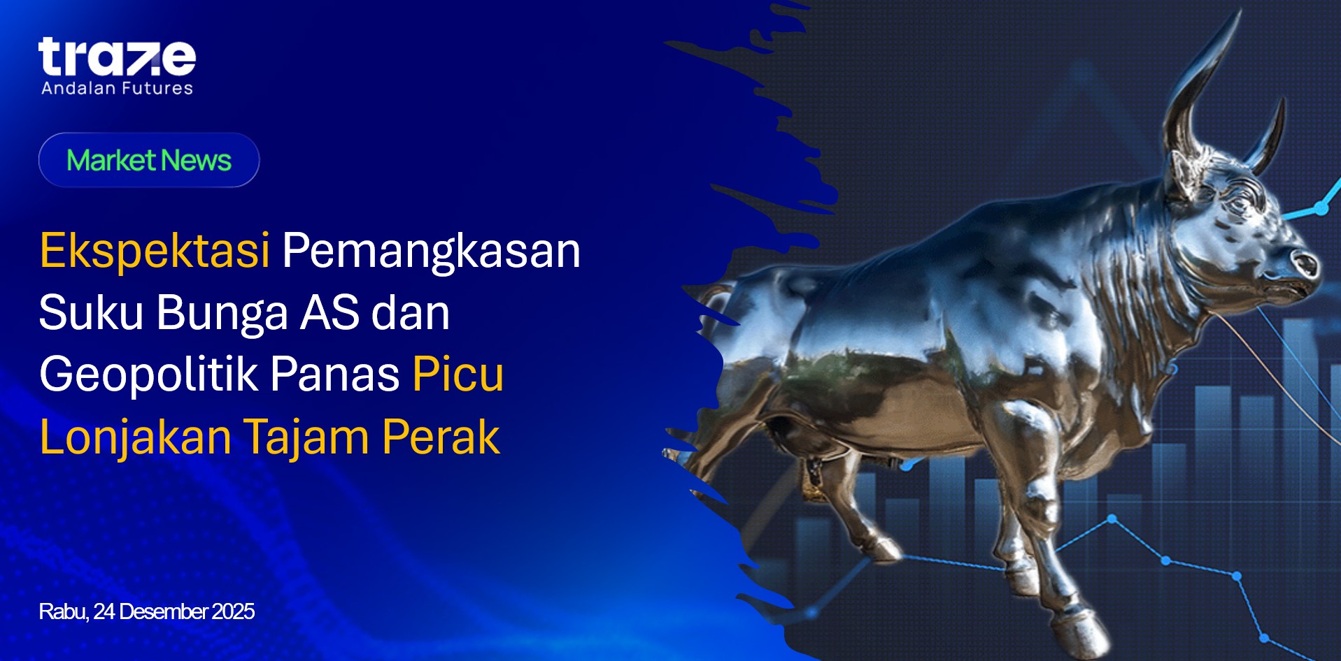 Harga perak melonjak menembus level USD 72 per ons pada perdagangan Rabu (24/12), mencetak rekor tertinggi baru setelah menguat empat sesi berturut-turut. Kenaikan ini didorong ekspektasi penurunan suku bunga Amerika Serikat serta meningkatnya minat terhadap aset lindung nilai di tengah ketidakpastian global.