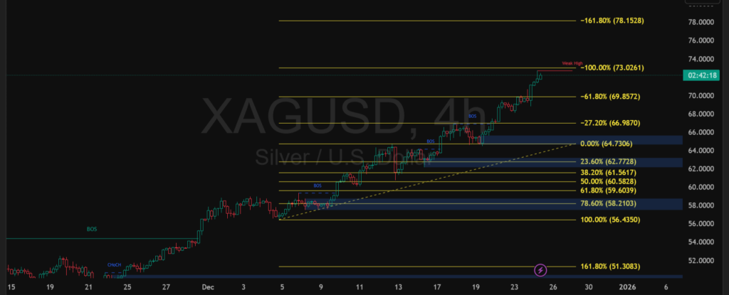 Pergerakan XAGUSD pada timeframe H4 menunjukkan tren naik yang sangat kuat, ditandai dengan rangkaian higher high dan higher low. Harga saat ini berada di area 73,00 yang bertepatan dengan level Fibonacci 100%, sekaligus area weak high sehingga berpotensi memicu reaksi jangka pendek. Selama harga bertahan di atas struktur sebelumnya, bias teknikal masih cenderung bullish.