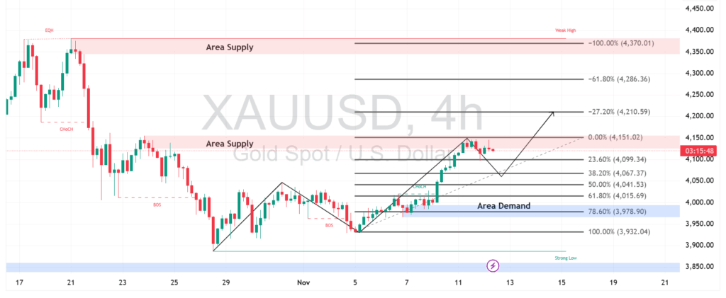 Pergerakan XAUUSD masih dalam tren naik setelah bertahan kuat di area demand sekitar 4.000. Pergerakan harga menunjukkan peluang koreksi ringan sebelum melanjutkan kenaikan ke zona supply 4.150.