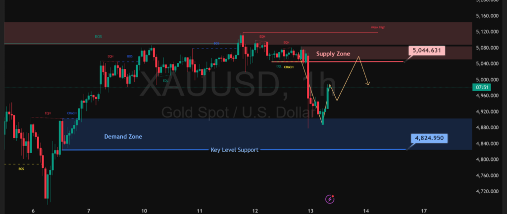 XAUUSD timeframe satu jam menunjukkan tekanan setelah gagal menembus supply zone 5.040 – 5.080. Munculnya break of structure dan change of character mengindikasikan pergeseran momentum ke arah bearish, dengan harga kini menguji demand zone sekaligus support kunci di area 4.820 – 4.830.