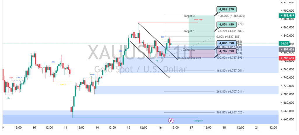 Jika momentum kenaikan berlanjut, target terdekat berada di area 4.851 hingga 4.887 yang menjadi resistance sekaligus target profit potensial. Namun, apabila harga kembali turun dan menembus area 4.787, maka skenario bullish bisa batal dan membuka peluang koreksi lebih dalam. Dengan kondisi ini, pelaku pasar disarankan mencermati reaksi harga di zona krusial untuk menentukan arah berikutnya.