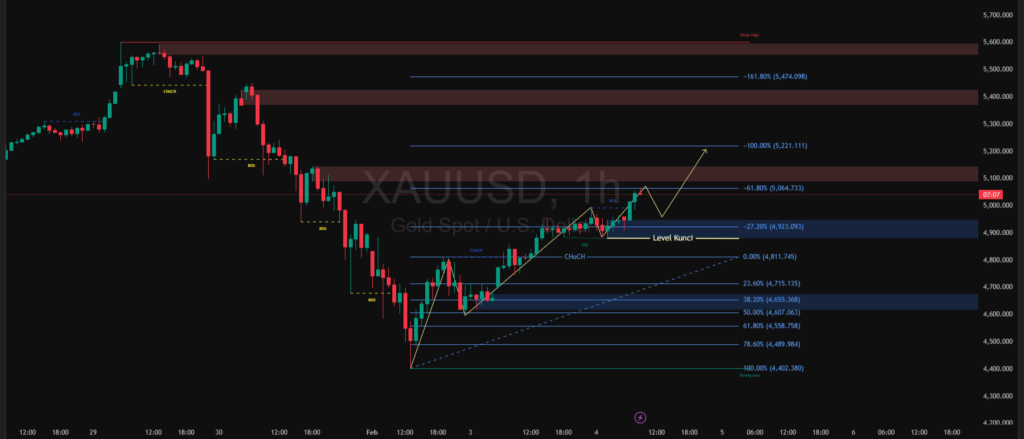 Pergerakan XAUUSD pada timeframe satu jam menunjukkan fase pemulihan setelah tekanan jual kuat sebelumnya. Harga berhasil membentuk struktur kenaikan bertahap, ditandai perubahan karakter tren dan penembusan struktur minor. Area sekitar level kunci menjadi penopang penting yang menjaga momentum tetap positif, selama harga bertahan di atas zona tersebut peluang lanjutan kenaikan masih terbuka.