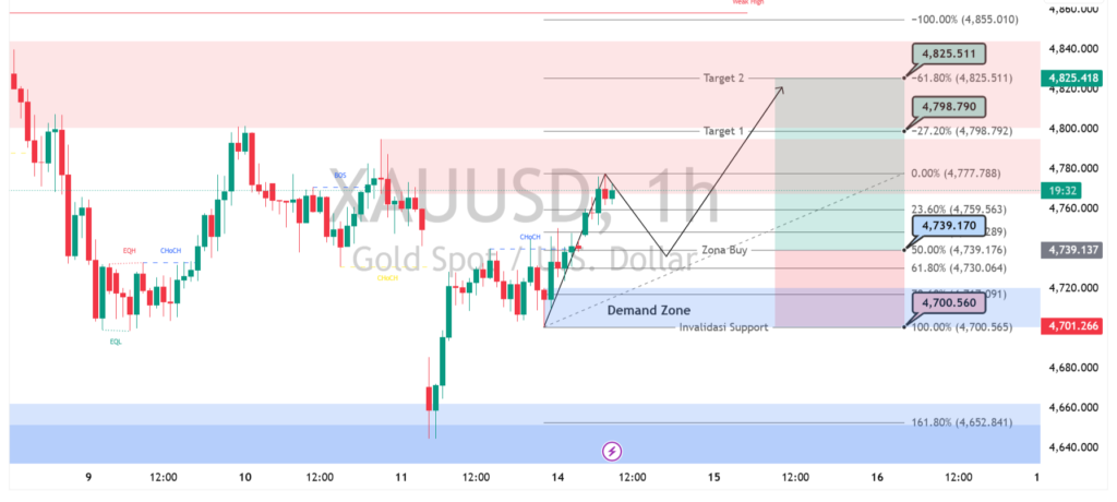 Jika skenario bullish berlanjut, harga berpeluang menguji resistance terdekat di area 4.798 sebagai target awal, lalu melanjutkan kenaikan menuju 4.825. Namun, perlu diwaspadai jika harga turun dan menembus di bawah 4.700, karena hal ini akan membatalkan bias naik dan membuka peluang pelemahan lebih dalam. Secara keseluruhan, momentum masih cenderung positif selama harga bertahan di atas demand zone.