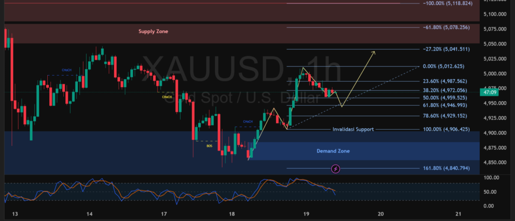 Secara teknikal, XAUUSD pada timeframe 1 jam menunjukkan potensi pemulihan setelah harga memantul dari area demand kuat di sekitar 4.850 – 4.900 dan membentuk struktur higher low. Pergerakan kini bergerak dalam fase konsolidasi di atas level 4.950 dengan bias naik selama harga bertahan di atas support dinamis tersebut. Area resistance terdekat berada di kisaran 5.010 hingga 5.040 yang menjadi kunci untuk melanjutkan momentum bullish.