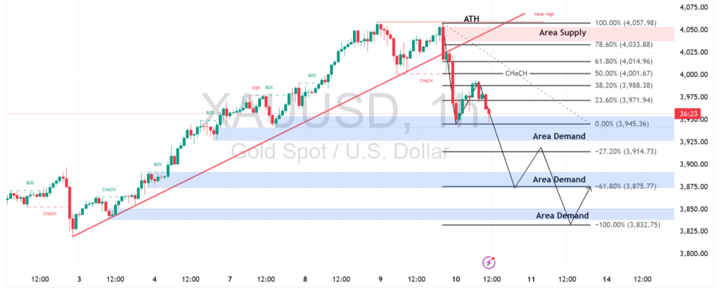 Harga emas (XAU/USD) kembali bergerak di bawah level psikologis $4.000, memperlihatkan tekanan jual setelah gagal bertahan di area supply dekat rekor tertinggi $4.059. Aksi ambil untung dan penguatan Dolar AS sementara waktu menekan minat beli logam mulia. Namun, zona $3.945 hingga $3.915 terlihat menjadi area demand potensial yang bisa menahan penurunan lebih dalam dalam jangka pendek.