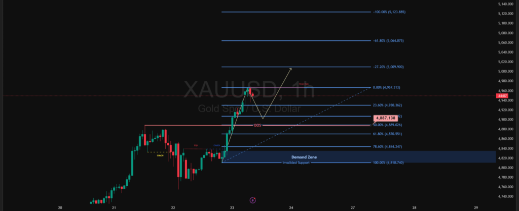 Secara teknikal, potensi pergerakan saat ini mengarah pada skenario pullback sehat sebelum melanjutkan kenaikan menuju area resistance terdekat di sekitar level Fibonacci ekstensi. Selama harga tetap berada di atas area invalidasi support, peluang lanjutan bullish masih terbuka lebar. Namun, kegagalan bertahan di zona tersebut dapat memicu koreksi lebih dalam, sehingga manajemen risiko tetap menjadi kunci dalam menyikapi volatilitas emas yang tinggi.