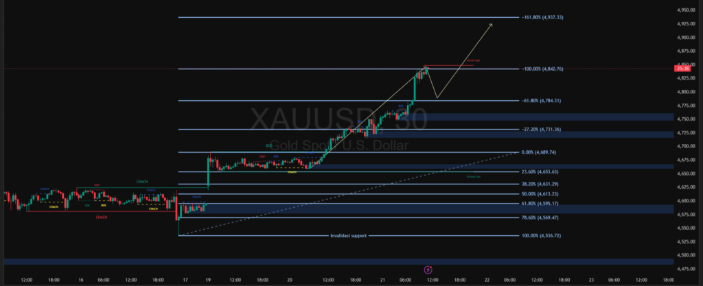 Meski demikian, potensi koreksi jangka pendek tetap perlu diantisipasi sebagai bagian dari pergerakan sehat pasar. Area retracement menjadi zona pantulan ideal sebelum reli berikutnya berlanjut menuju target lanjutan. Selama support kunci tidak ditembus, skenario kenaikan emas masih valid, dengan strategi buy on pullback dinilai lebih aman dibanding mengejar harga di puncak.