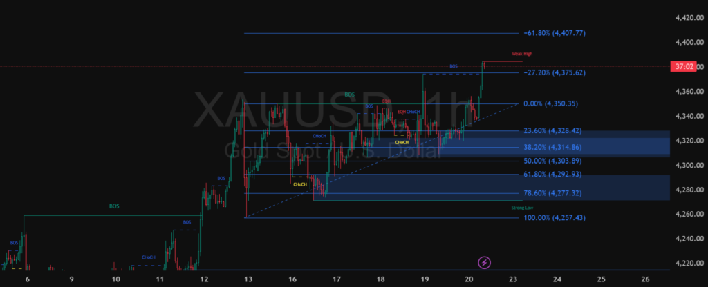 Pergerakan XAUUSD masih berada dalam tren naik, didukung struktur higher high dan higher low. Area 4.375 – 4.380 menjadi resistance penting setelah terbentuk weak high, sehingga potensi koreksi jangka pendek tetap terbuka selama harga tertahan di zona tersebut.