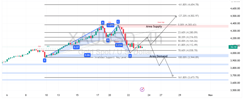 Pergerakan harga emas menunjukkan pelemahan setelah gagal menembus zona penawaran $4.380–$4.400. Penurunan berlanjut menuju wilayah permintaan $3.940–$4.000, yang kini menjadi titik penentu bagi pembalikan atau kelanjutan tren negatif.