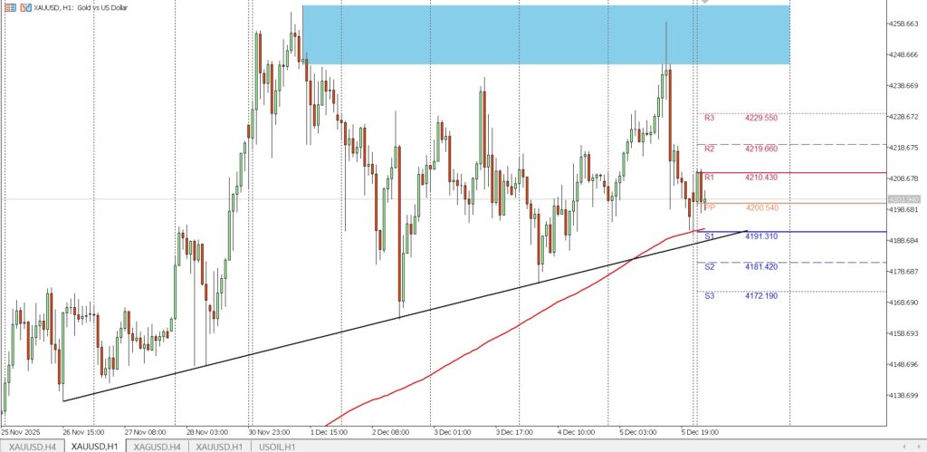 Namun, bila tekanan jual berlanjut dan harga turun ke bawah S1 di 4191, emas berpotensi melanjutkan koreksi menuju S2 di 4181. Peluang trading berada pada buy on dip di area S1–S2 selama struktur uptrend tetap terjaga, dengan target kembali ke R1 hingga zona supply atas.