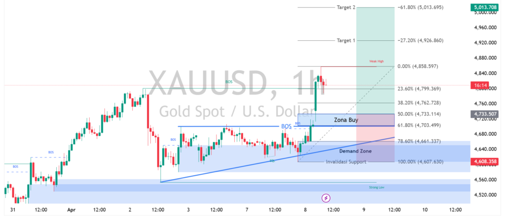 Harga emas melonjak lebih dari 2% hingga menembus level $4.800 per ounce pada Rabu (08/04), melanjutkan tren penguatan dalam beberapa sesi terakhir. Kenaikan ini dipicu oleh keputusan Presiden AS, Donald Trump, yang menunda rencana serangan terhadap infrastruktur sipil Iran selama dua minggu guna memberi ruang bagi negosiasi damai. Langkah tersebut meredakan ketegangan geopolitik dan mendorong minat investor terhadap aset safe haven seperti emas.