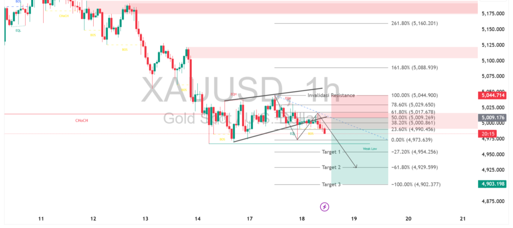 Jika tekanan jual berlanjut, harga berpotensi melanjutkan penurunan ke area target berikutnya di kisaran 4.950 hingga 4.930. Namun, skenario ini bisa berubah apabila terjadi rebound kuat dan harga kembali menembus resistance 5.020 – 5.040, yang berpotensi membatalkan bias bearish jangka pendek. Selama harga tetap berada di bawah area invalidasi tersebut, peluang turun masih lebih dominan dengan konfirmasi lanjutan dari struktur lower low.