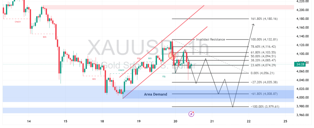 Dalam jangka pendek, harga berpotensi turun bertahap menuju area 4.056 hingga 4.035, sebelum menguji zona demand lebih dalam di sekitar 4.020. Area ini menjadi titik penting untuk melihat apakah pembeli kembali masuk.