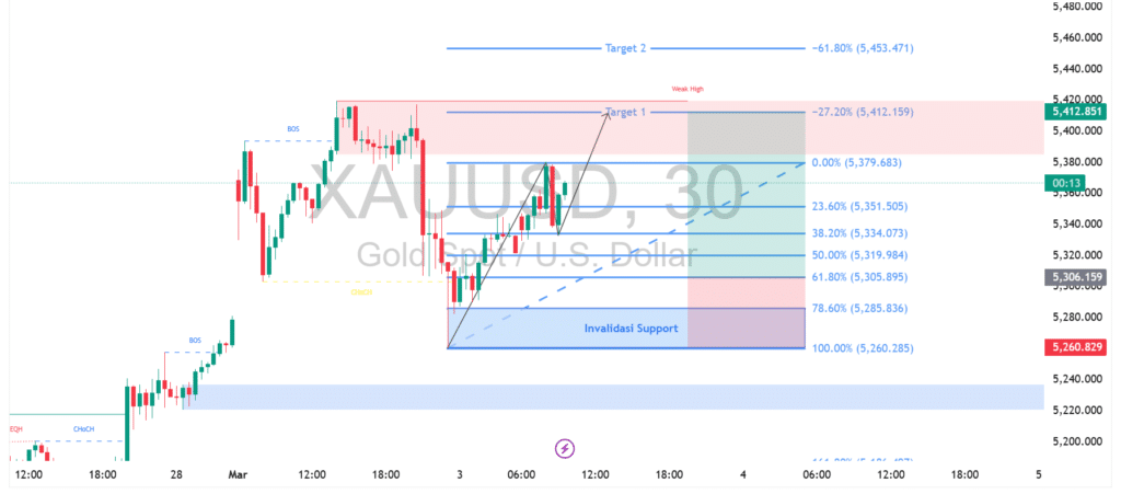 Jika dorongan beli berlanjut, emas berpotensi menguji resistance 5.379 lalu melanjutkan kenaikan menuju 5.412 sebagai target berikutnya. Skenario teknikal juga memperlihatkan potensi pembentukan puncak sementara sebelum reli diperpanjang. Namun, penembusan di bawah area invalidasi 5.260 dapat mengubah bias menjadi korektif. Secara keseluruhan, tren intraday masih condong positif selama support utama tidak ditembus.