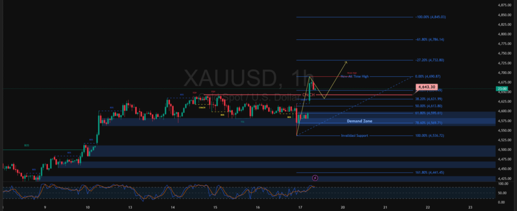 Pergerakan XAUUSD pada timeframe satu jam menunjukkan struktur bullish yang tetap terjaga setelah terjadi break of structure dan change of character ke arah atas. Lonjakan kuat dari area bawah menandakan respons agresif buyer, sementara zona demand di kisaran bawah berfungsi sebagai penopang utama pergerakan. Selama harga mampu bertahan di atas area tersebut, bias kenaikan masih dominan dengan peluang melanjutkan tren positif.