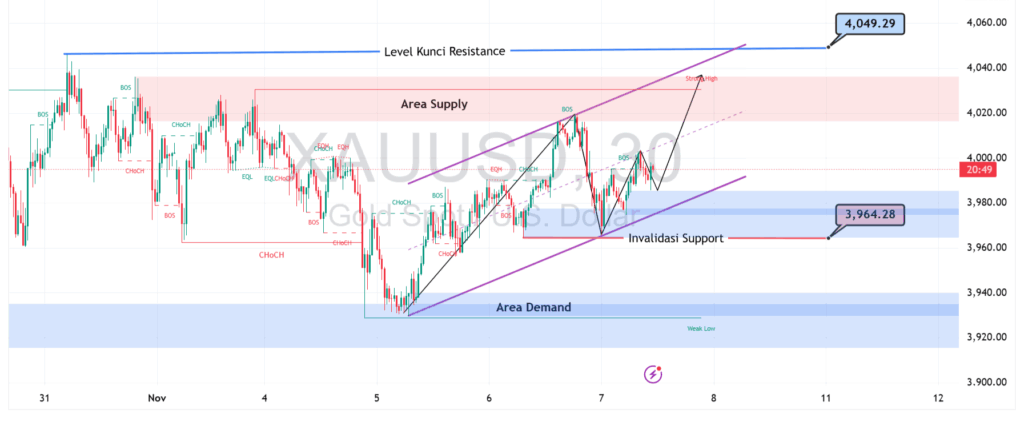Jika emas mampu menjaga level ini, peluang kenaikan menuju zona supply $4.020–$4.050 tetap terbuka. Namun, penembusan di bawah $3.964 bisa memicu koreksi ke area demand sekitar $3.940.