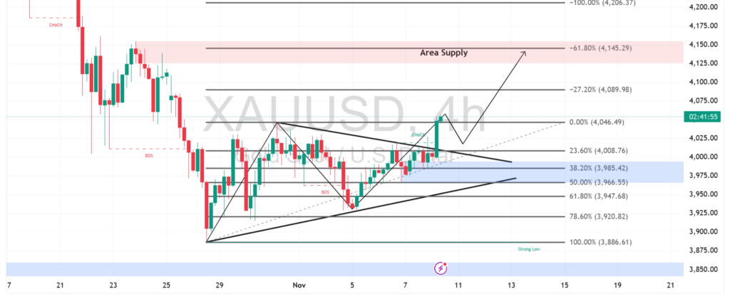 XAUUSD pada grafik 4 jam menembus pola segitiga simetris, memberi sinyal penguatan menuju area supply di sekitar $4.145. Kenaikan ini menunjukkan momentum beli masih solid setelah harga bertahan di atas level penting $4.000.