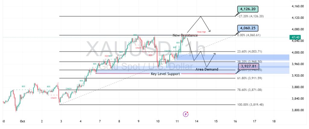 Harga emas (XAU/USD) bergerak stabil di sekitar $4.060 per ons setelah menyentuh rekor baru pada sesi sebelumnya. Arah tren masih menunjukkan dominasi bullish selama harga bertahan di atas area demand $3.927–$3.968. Struktur pasar memperlihatkan pembentukan higher low konsisten, menandakan potensi lanjutan menuju target berikutnya di $4.126 jika momentum beli terus berlanjut.