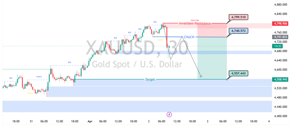 Secara teknikal, target penurunan terdekat berada di kisaran 4,740 sebagai support minor, sementara tekanan lebih dalam berpotensi membawa harga menuju area 4,557 yang menjadi zona likuiditas berikutnya. Selama tidak ada penembusan kembali ke atas resistance, bias pasar cenderung bearish dengan potensi lower low baru. Namun, reaksi harga di area support akan menjadi kunci untuk menentukan apakah penurunan berlanjut atau terjadi pantulan jangka pendek.