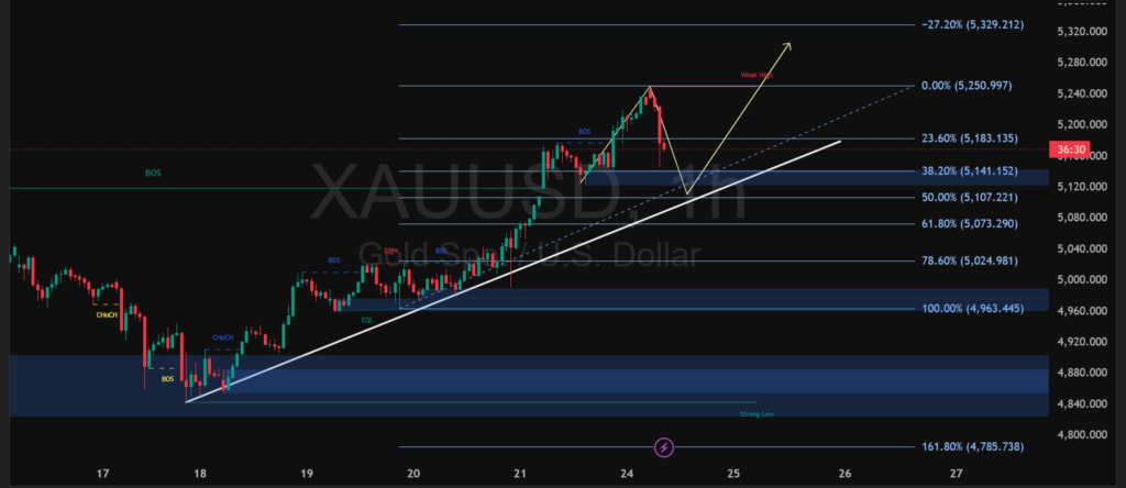 Pergerakan harga emas XAUUSD pada timeframe 1 jam masih menunjukkan tren naik yang solid setelah terjadi breakout struktur (BOS) dan terbentuknya higher high. Saat ini harga sedang mengalami koreksi wajar setelah menyentuh area resistance “weak high”, dengan garis tren naik tetap menjadi penopang utama. Selama harga bertahan di atas trendline dan tidak menembus zona support terdekat, bias bullish masih mendominasi.
