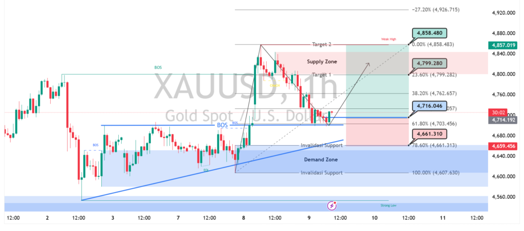 Namun demikian, area supply di atas masih menjadi penghalang kuat yang berpotensi memicu penolakan harga. Selama belum mampu menembus zona tersebut dengan momentum yang solid, risiko penurunan lanjutan tetap perlu diwaspadai. Apabila support 4.661 gagal dipertahankan, harga berpotensi melanjutkan pelemahan menuju demand zone lebih rendah di sekitar 4.607. Dengan kondisi ini, pelaku pasar sebaiknya menunggu konfirmasi arah yang lebih jelas sebelum mengambil posisi, mengingat volatilitas masih cukup tinggi.