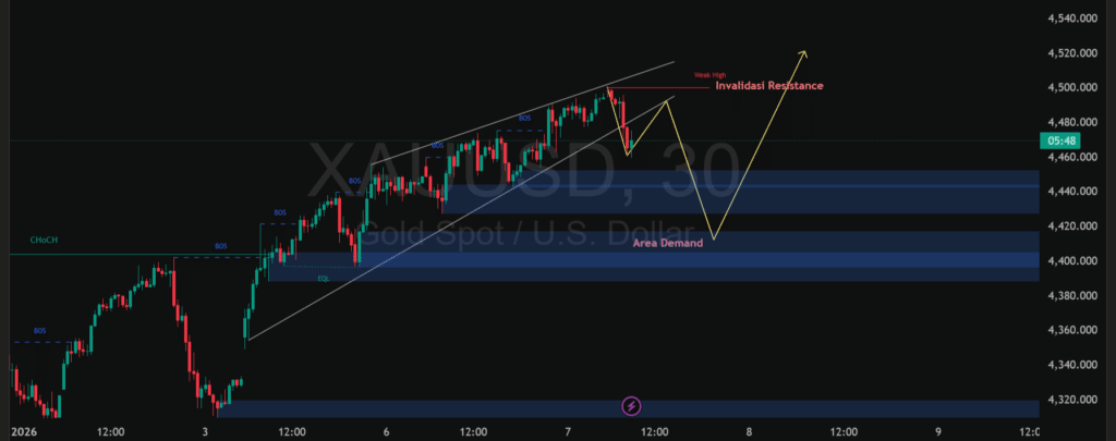 Secara teknikal, area demand di bawah menjadi fokus utama karena berpotensi menahan penurunan dan memicu reaksi beli baru. Selama harga mampu bertahan di zona tersebut, peluang rebound tetap terbuka dengan target kembali menguji resistance atas channel. Skenario ini memperkuat bias bullish jangka menengah, sementara kegagalan bertahan di area demand dapat mengubah struktur pasar menjadi lebih berhati-hati.