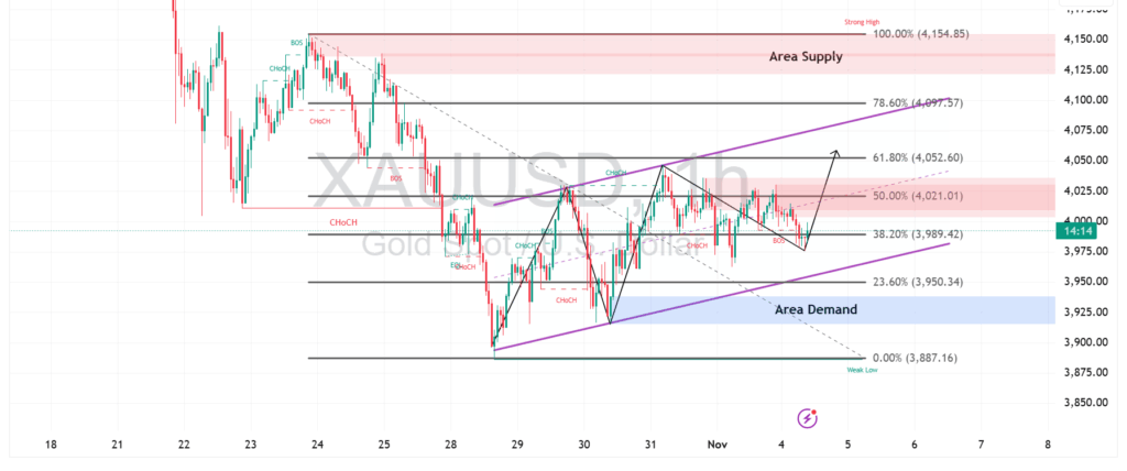 Emas saat ini bergerak dalam pola kenaikan yang menyempit, mirip seperti pegas yang sedang ditekan, menandakan pergerakan besar akan segera terjadi. Fokus utama pembeli (bullish) adalah zona Demand kuat di sekitar $3.910 – $3.935. Selama harga bertahan di atas level ini, tekanan beli masih ada, dengan harapan harga akan menguji level kunci psikologis $4.000 hingga $4.021 (Fibonacci 50%).