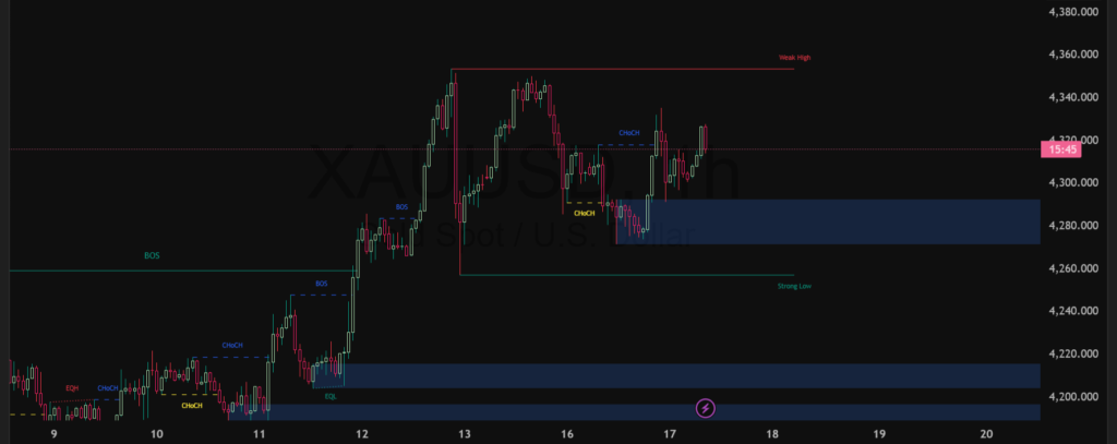 Pergerakan XAUUSD grafik H1 masih bullish meski bergerak konsolidatif di bawah area weak high sekitar 4.350. Struktur BOS sebelumnya menegaskan kekuatan buyer, sementara kemunculan ChoCH menunjukkan pasar tengah menunggu katalis lanjutan.