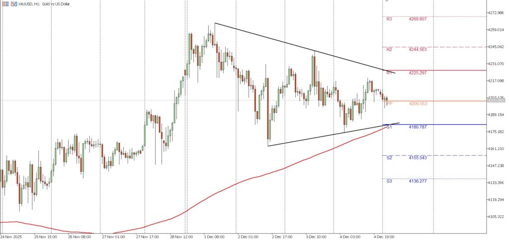 Sebaliknya, penurunan di bawah S1 4.180 berisiko mendorong harga ke S2 4.155 dan S3 4.136. Selama harga masih di dalam pola triangle dan dekat area pivot, emas cenderung menunggu pemicu fundamental, dengan peluang breakout kuat ketika batas atas atau bawah pola terlampaui.