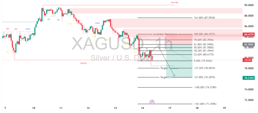 Selama harga tetap berada di bawah area resistance 82.5 – 84, potensi pelemahan masih terbuka dengan target teknikal pertama di sekitar 78 sebagai area support berikutnya. Jika tekanan jual berlanjut dan level ini ditembus, pergerakan dapat berlanjut menuju area 76 yang menjadi target lanjutan berdasarkan proyeksi Fibonacci. Namun, skenario bearish bisa melemah apabila harga kembali menembus dan bertahan di atas 84, yang berpotensi memicu pemulihan jangka pendek pada perak.
