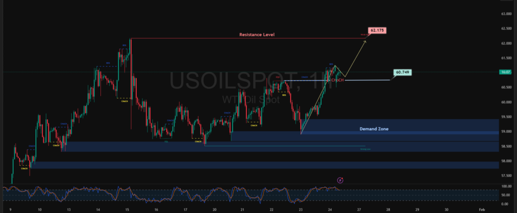 Harga minyak WTI pada timeframe H1 menunjukkan perubahan struktur ke arah bullish, terlihat dari terbentuknya break of structure setelah harga memantul kuat dari area demand. Kenaikan ini mengindikasikan dominasi buyer mulai mengambil alih, dengan pergerakan harga yang kini bertahan di atas support intraday sekitar 60.7 sebagai pijakan utama kelanjutan tren naik.