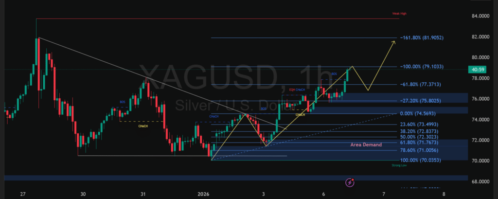 Secara teknikal, zona 75,8 – 77,3 menjadi area penting untuk menjaga momentum kenaikan sebelum harga mengarah ke target 79,1 hingga 81,9 di area supply. Selama perak mampu bertahan di atas support kunci, peluang kelanjutan reli tetap terbuka, dengan potensi koreksi sehat sebagai bagian dari penguatan tren.