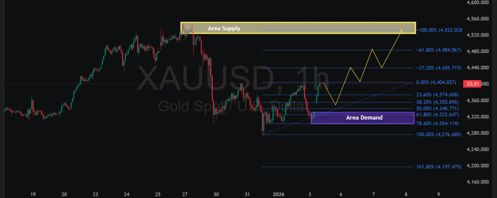 Selama emas mampu mempertahankan area support tersebut, potensi kenaikan terbuka menuju resistance 4.440 hingga 4.485, dengan target lanjutan mengarah ke zona supply 4.520 – 4.550. Pola gelombang naik yang terbentuk mencerminkan dominasi buyer meski volatilitas tetap tinggi. Skenario bullish tetap relevan selama harga tidak menembus demand secara signifikan.