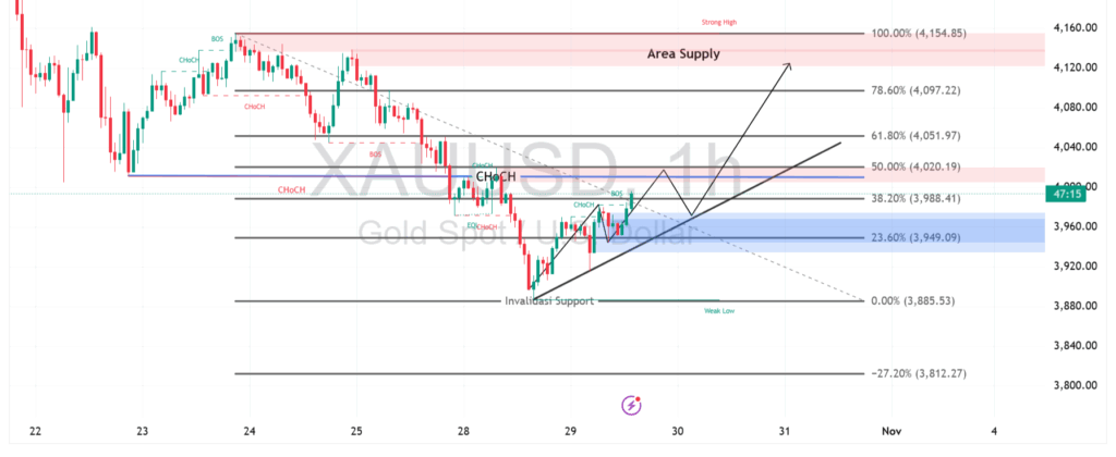 Level Fibonacci 38,2%–50% di $3.988–$4.020 menjadi area penting untuk mengonfirmasi arah berikutnya. Jika harga menembus zona ini dengan volume tinggi, target berikutnya berada di $4.052 dan $4.120. Sebaliknya, tekanan jual dapat memicu koreksi ringan menuju area demand $3.950–$3.940 sebelum melanjutkan kenaikan.