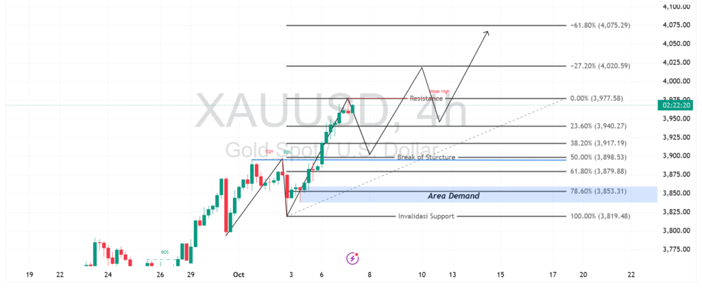 Harga emas (XAU/USD) masih menunjukkan momentum bullish kuat, mendekati level psikologis $3.980 per ons. Namun, grafik 4 jam memperlihatkan potensi koreksi teknikal jangka pendek menuju area demand di sekitar $3.850–$3.880, sebelum kemungkinan melanjutkan reli. Area ini menjadi zona penting bagi buyer untuk mempertahankan tren naik yang telah terbentuk sejak awal Oktober.