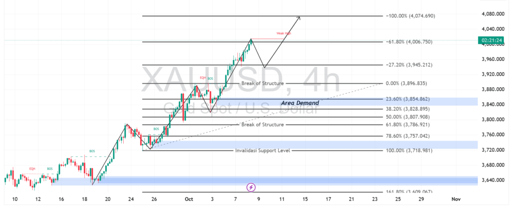 Harga emas (XAU/USD) tetap kuat di atas $4.000 per ons, menegaskan dominasi tren naik setelah serangkaian break of structure yang menandakan potensi reli lanjutan menuju area $4.075. Meski demikian, peluang koreksi ringan tetap terbuka sebelum kenaikan berikutnya.