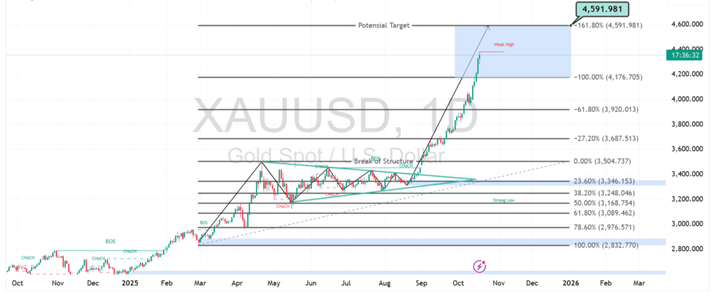 Target kenaikan berikutnya terlihat di area Fibonacci extension 161,8% di sekitar $4.590–$4.600, yang menjadi potensi area psikologis baru bagi pelaku pasar. Sentimen dovish The Fed dan meningkatnya permintaan aset safe haven memperkuat keyakinan bahwa harga emas masih memiliki ruang lebar untuk melanjutkan reli. Dalam jangka menengah, setiap koreksi diprediksi hanya bersifat teknikal sebelum harga kembali menanjak.